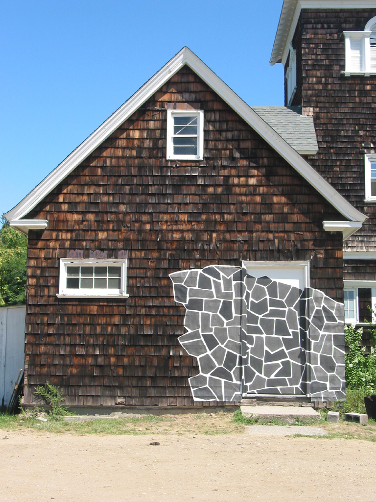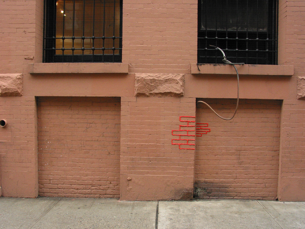 “I often draw attention to parts of a site that might otherwise be unnoticed or taken for granted,” writes Portland, OR-based artist Amy Bay. “I do this through a kind of mimicry or replication of forms found at the site, often whittling them down to quintessential elements. This comes from a personal tendency to find meaning and importance in things that are considered commonplace or banal.” Objects such as building brick, for instance, which she chose to outline in lipstick red on an exterior wall for an installation in Manhattan. Bay’s isolation of the mundane describes, to borrow the words of artist John Baldessari, a personal “hierarchy of viewing.”