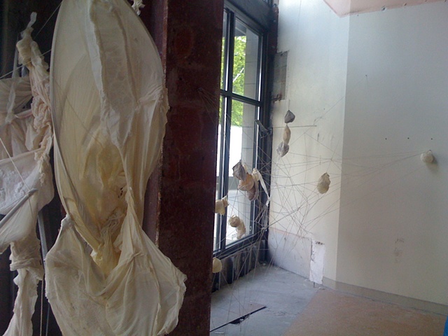 The MFA research acquainted her with yet another natural element, borax crystals, which she would eventually grow on hanging silk sculptures: “The borax crystals were kind of a play on salt crystals, sweat.” In a previous project, Barbee had worn a single skirt for three months, then soaked it in borax solution, and made it into a non-representational self-portrait. “I did this project four times, resulting in a year’s worth of skirts, called seasonal skirts.