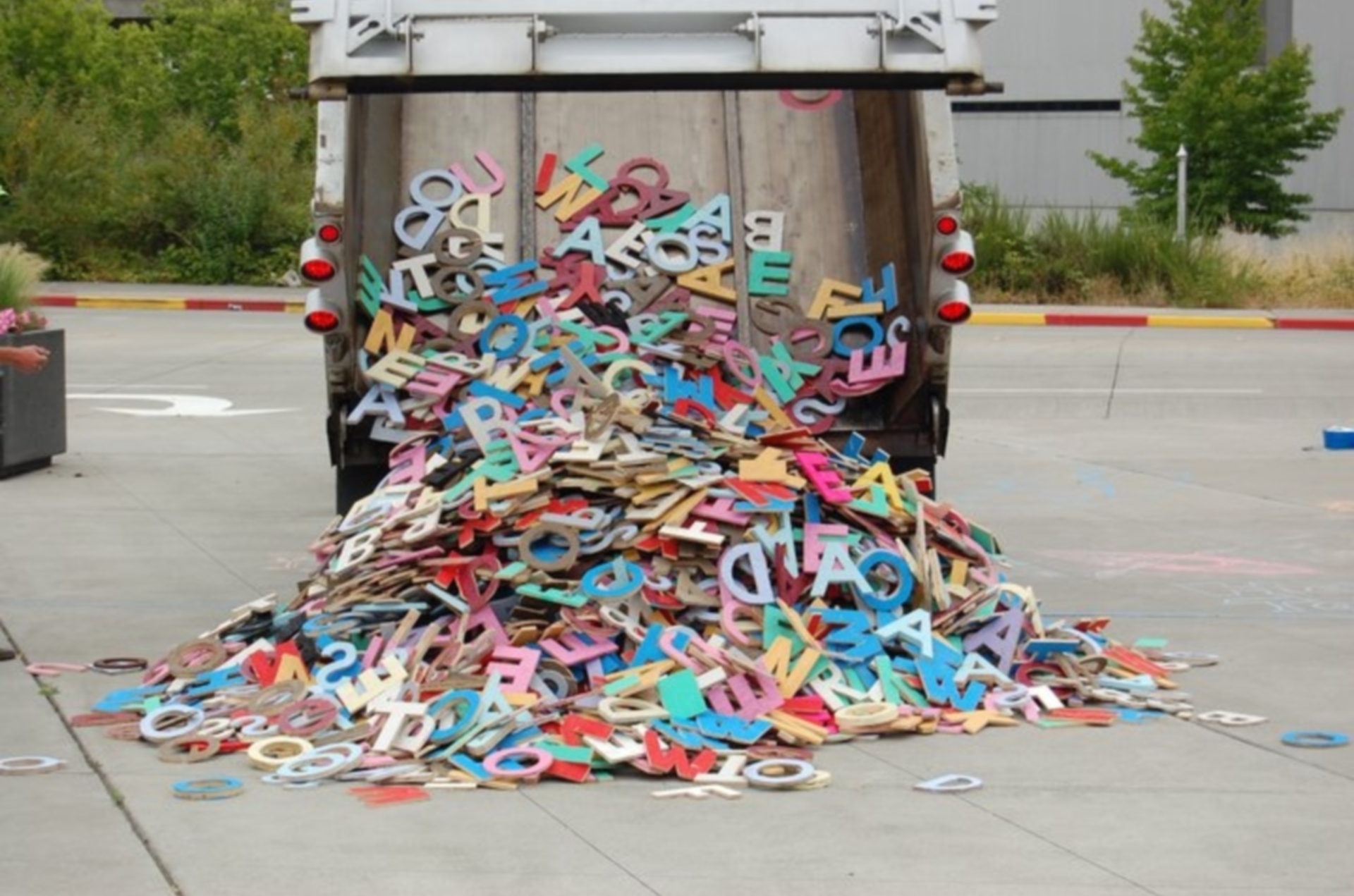 Words, a new temporary installation by Tacoma artist James Grayson Sinding will drop in Tollefson Plaza August 6 at 2pm. Come be part of the installation as Sinding dramatically dumps hundreds of hand-painted wooden words, refrigerator-magnet-style, onto the plaza out of the back of a shiny dump truck. The public is invited to create messages, climb, stack, and otherwise interact with the new installation. Words will be in Tollefson Plaza through the end of August 2011. Tollefson Plaza is located in downtown Tacoma at Pacific Avenue and S. 17th Street.