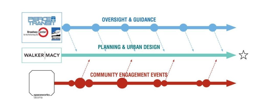 TRANSFORM is a project initiated in 2017 by Pierce Transit, City of Tacoma and Broadway Center for the Performing Arts, aimed at revitalizing Tacoma’s Theater District. These three project partners are committed to working with the community to explore how they can improve the design, function, and programming of public spaces and streets in the Theater District, and develop a plan to redesign the transportation and cultural hub framed by 9th and 11th Streets between Broadway and Pacific Avenue into a vibrant area at the heart of downtown. Learn more about TRANSFORM development process.