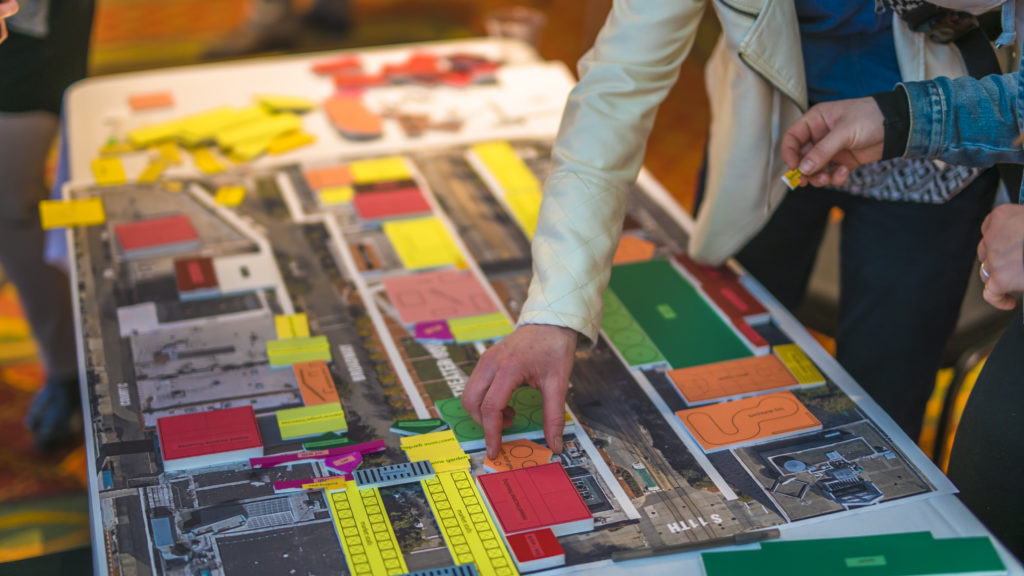 To engage the community and invite feedback Spaceworks Tacoma has been creating visible transformations to the district by programming visual art and performances by local artists in existing and unusual spaces. The next public input event will be held in the summer of 2018 with a block party in Theater Square park.