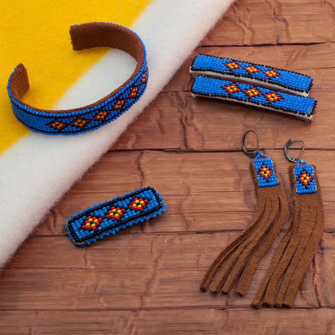 Blue beaded jewelry, seed beads and leather. Artist Paige Pettibon. Photo by Blair Alexander.