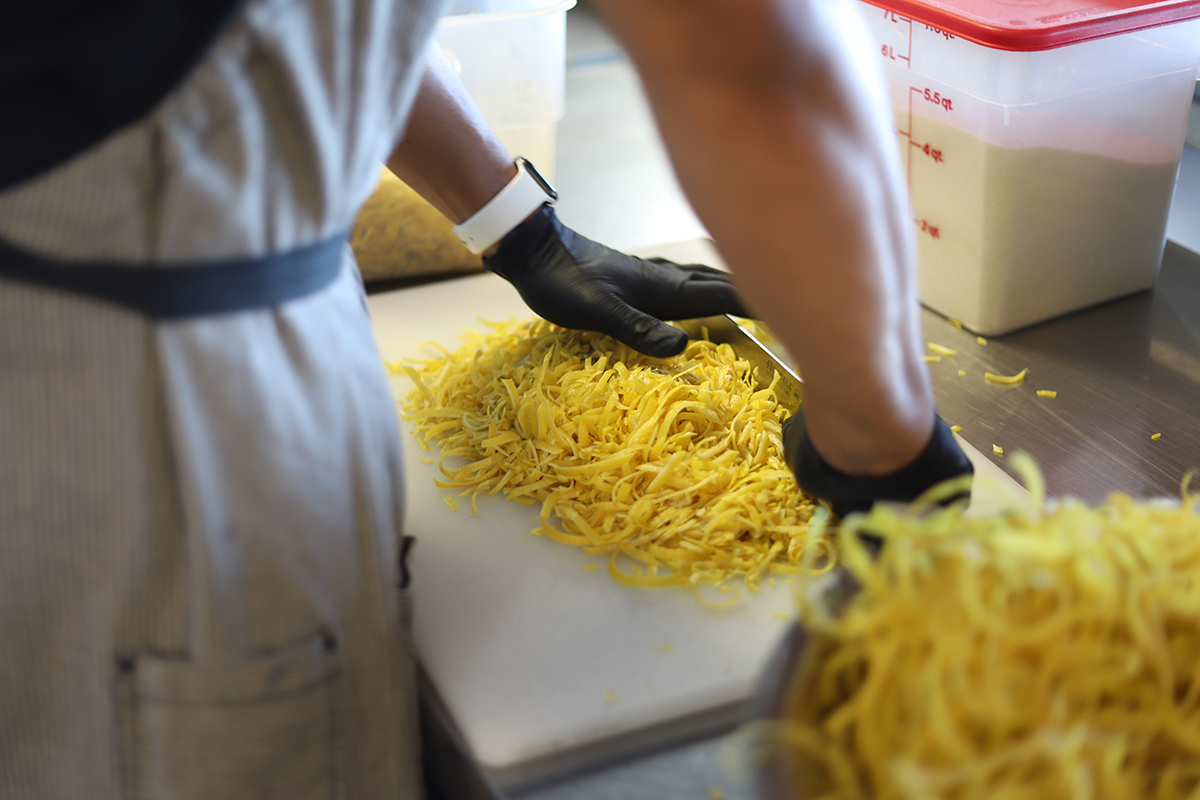 AM: Citrus oleo. It’s citrus zest macerated in sugar until the oils and moisture in the zest dissolve the sugar. The resulting syrup is potent and adds a very bright, zesty flavor to everything. A little goes a long way. We do all this by hand for our products because the flavor cannot be replicated. It’s a staple. I make it at home, too, for cocktails and punches. It makes a real difference.