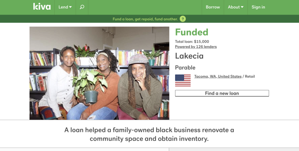 “With the Kiva loan, we were able to make the necessary renovations that allowed us to open our storefront to the McKinley community,” says Lakeisha Farmer, owner of Parable Tacoma. Lakeisha and her two sisters were the first recipient of a Kiva microloan, raising $15,000 in less than three days.