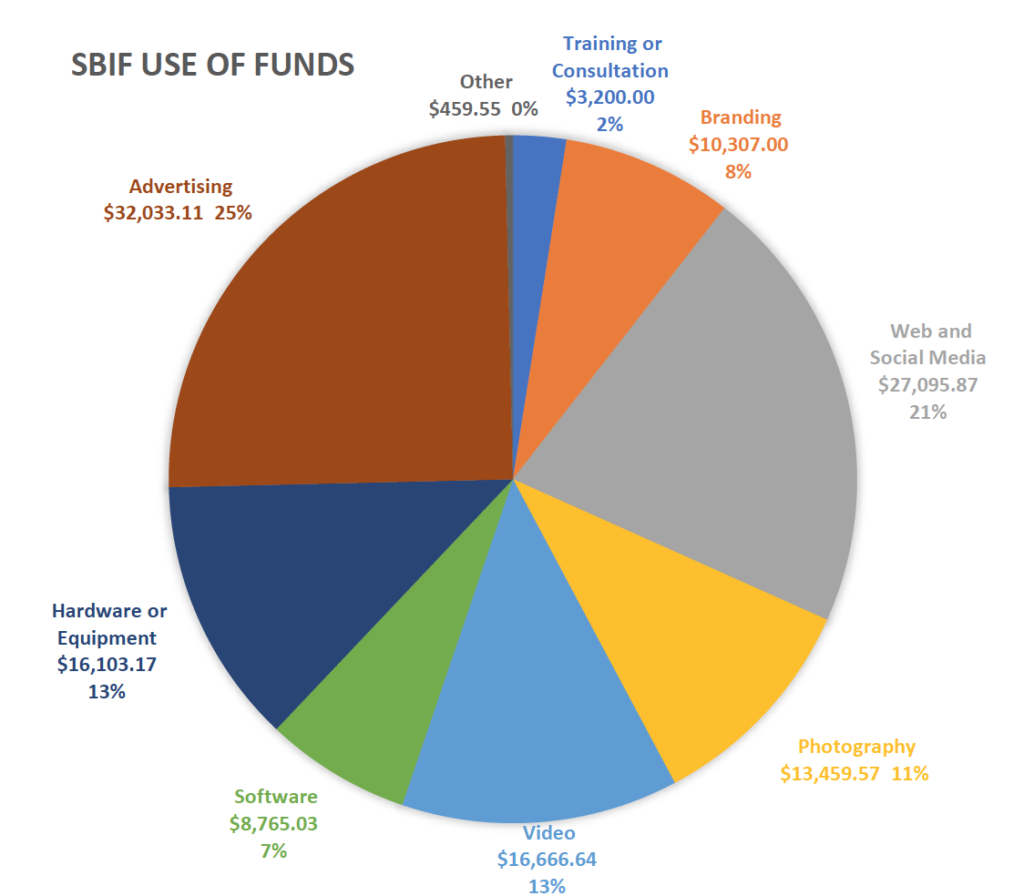 The graph below shows the many ways the 40 recipients chose to use their funding. For some, this meant new professional business photos of their storefront and staff. For others, upgrades came in the form of new hardware or software, website and e-commerce platform updates, and advertising and branding. Spaceworks staff also worked one-on-one with the businesses, providing technical assistance and troubleshooting during the project.