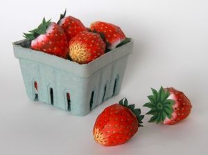 Chandler O’Leary, “Berry Basket”, Ten life-sized paper strawberries in a found berry basket; from the “Farm to Table” series (2016)