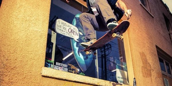 Grit City Grindhouse owner Bobby Boyle shows customer skateboard trucks