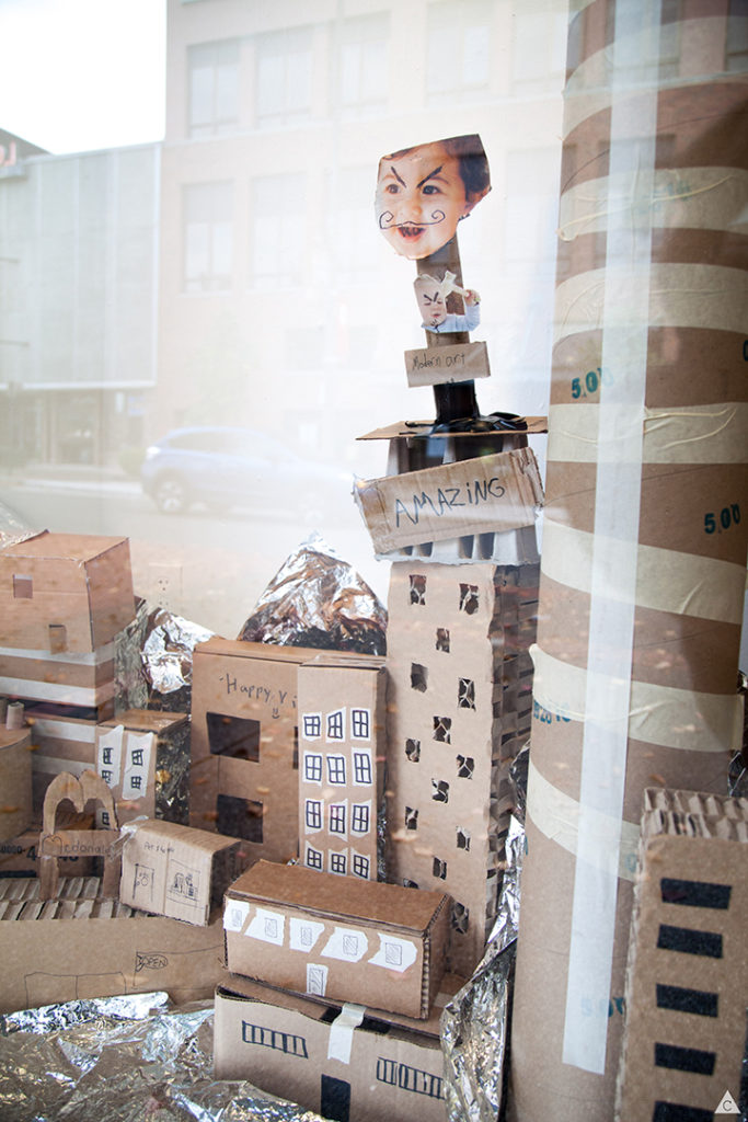 Angela Larsen states “Students have been studying modernity and the modern city with their general education classes and we are using these windows as the first opportunity to collaborate on an artwork as well as a way to explore the idea of buildings and their components. Students are working individually or in small groups to build their structures only using cardboard, tape, and glue and we will work as a team to install the final piece into a stacked cluster type city. The buildings reflect very primitive materials and construction and that are contrasted by metallic cellophane surrounding the structures on the floor of the windows.”