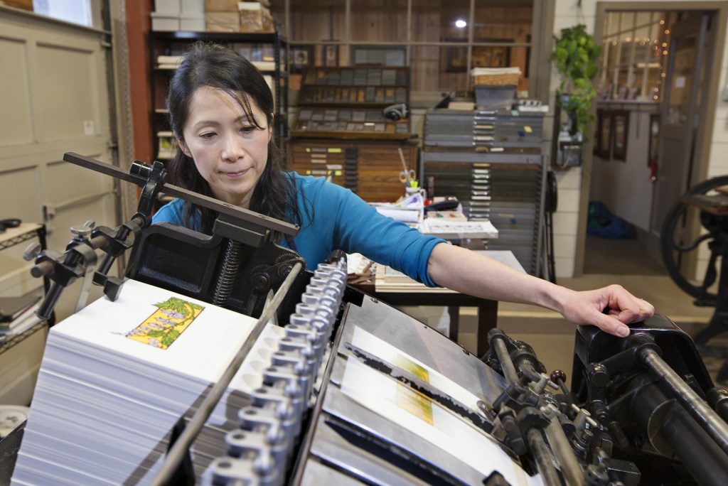 Founded by Yoshiko Yamamoto & Bruce Smith, The Arts & Crafts Press is a small letterpress printing studio. Begun as a publishing house concerned with the historic Arts and Crafts movement, all the publications of The Arts and Crafts Press have been letterpress printed and bound by hand. Today the Press produces greeting cards and limited-edition blockprints that are letterpress printed from hand cut blocks inspired by the turn-of-the-century movement. All current note cards and prints are designed by Yoshiko Yamamoto. The Arts & Crafts Press are Spaceworks Alumni that identified and leased their own space in November 2014.