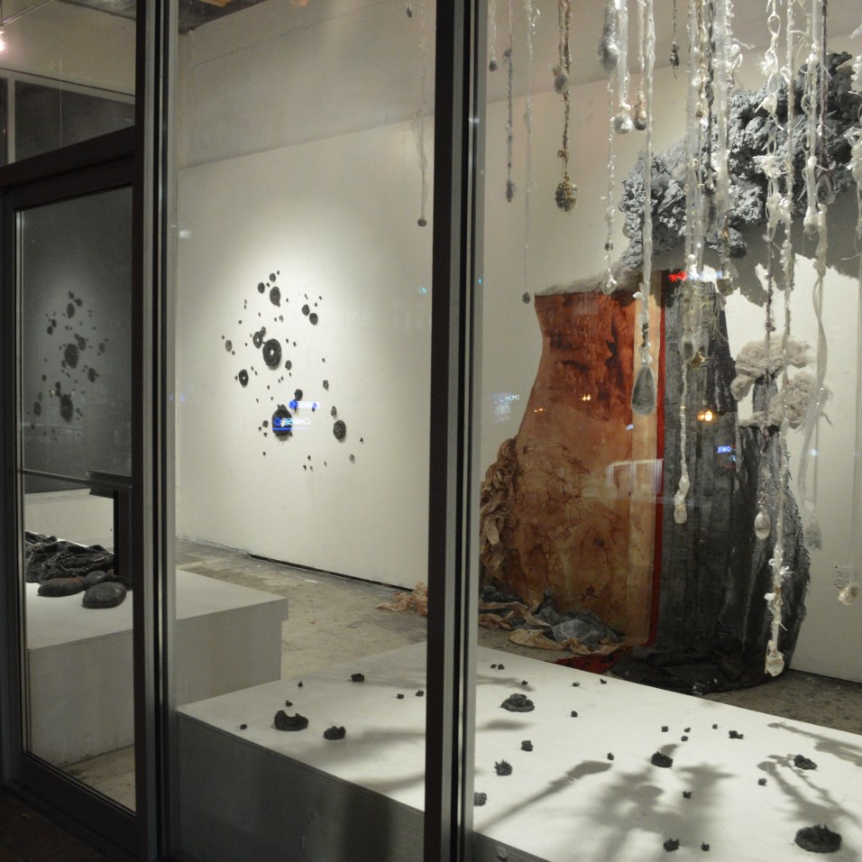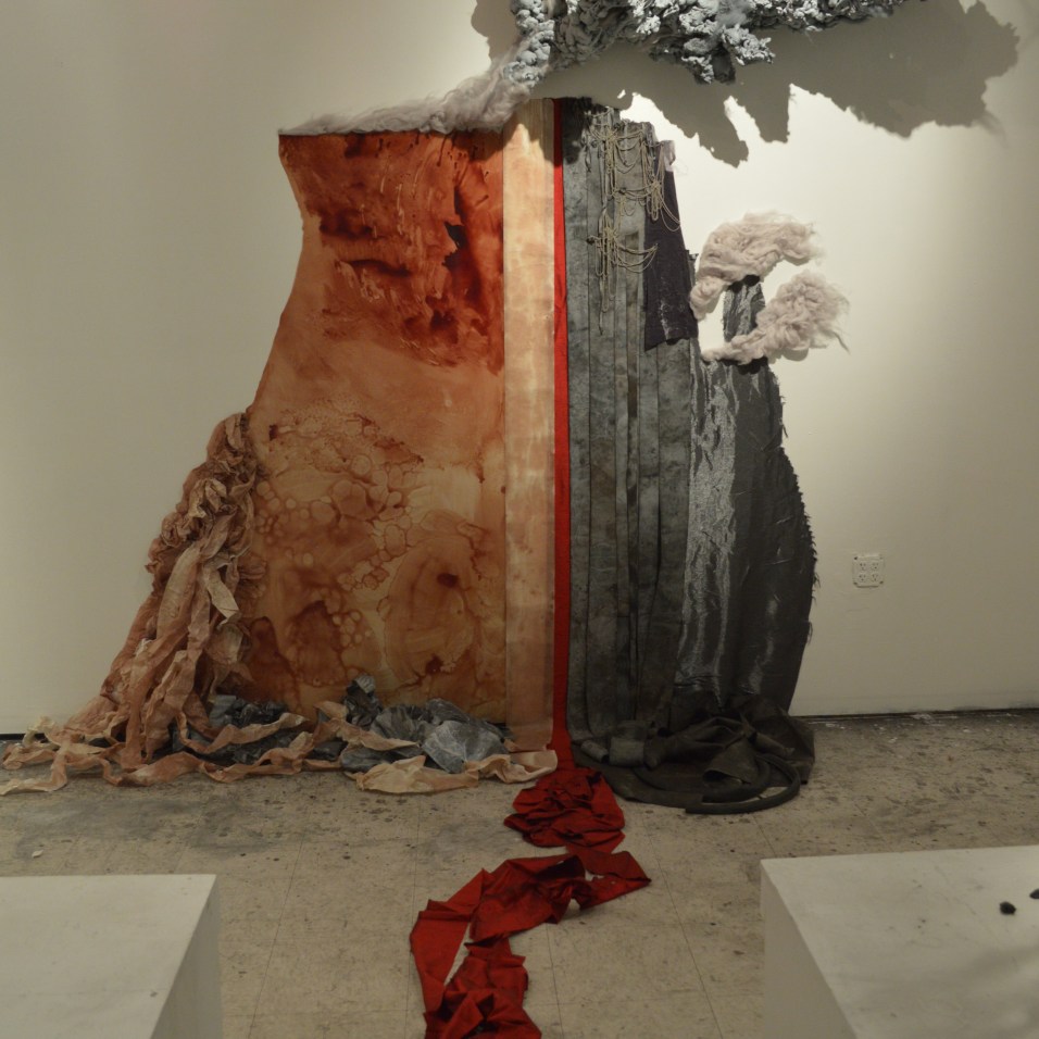 “This volcano portrait includes impact craters, the slow advance of Pahoehoe lava, vertical thrust of volcanic strata, and the rain of ash holding its breath for a brief second… In an installation made of disparate materials – from construction spray foam to merino wool, packing tape to pantyhose – this ‘still life with volcano’ encompasses the experience of danger at a distance becoming beautiful.”
