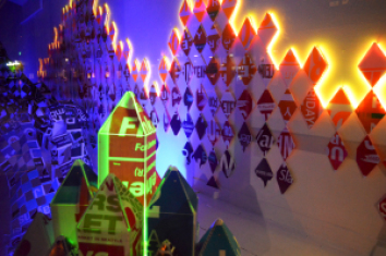 “’Color Wave’ created for Tacoma Spaceworks Window #2 is constructed from common plastic yard signs woven together with twine and pins and enhanced at night with animated, colored lights. The advertising and political content is fractured and obscured allowing the beauty of color and graphic design to remain as waves of color flowing throughout the window space. Along with a strong sense of pattern and geometry, these materials are also arranged in subtle references to waves, mountains, horizon line, and greenery thus contrasting to the hard edge shapes they are made from. The line between what is “natural” and “unnatural” is blurred, while the displacement of organic materials by synthetic materials hints at a growing imbalance between the two.”