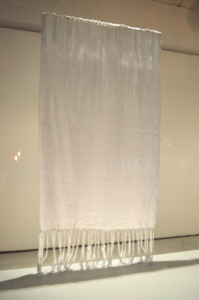 Priscilla Dobler’s installation will begin all white and minimal including two hand woven, cotton textiles. Over the course of the exhibition the space will transform into a lively, colorful, and productive space. The artist will be performing in the window October 14 -18, all day and night, with her floor loom and colorful cotton threads. The woven pieces she creates during this performance will be given away to the homeless, available for sale to passersby, or left in the window for the remainder of the exhibition. During the day, the public will be invited into the window to talk with the artist and even buy smaller woven pieces (a percentage of the proceeds would go to a shelter in Tacoma.)