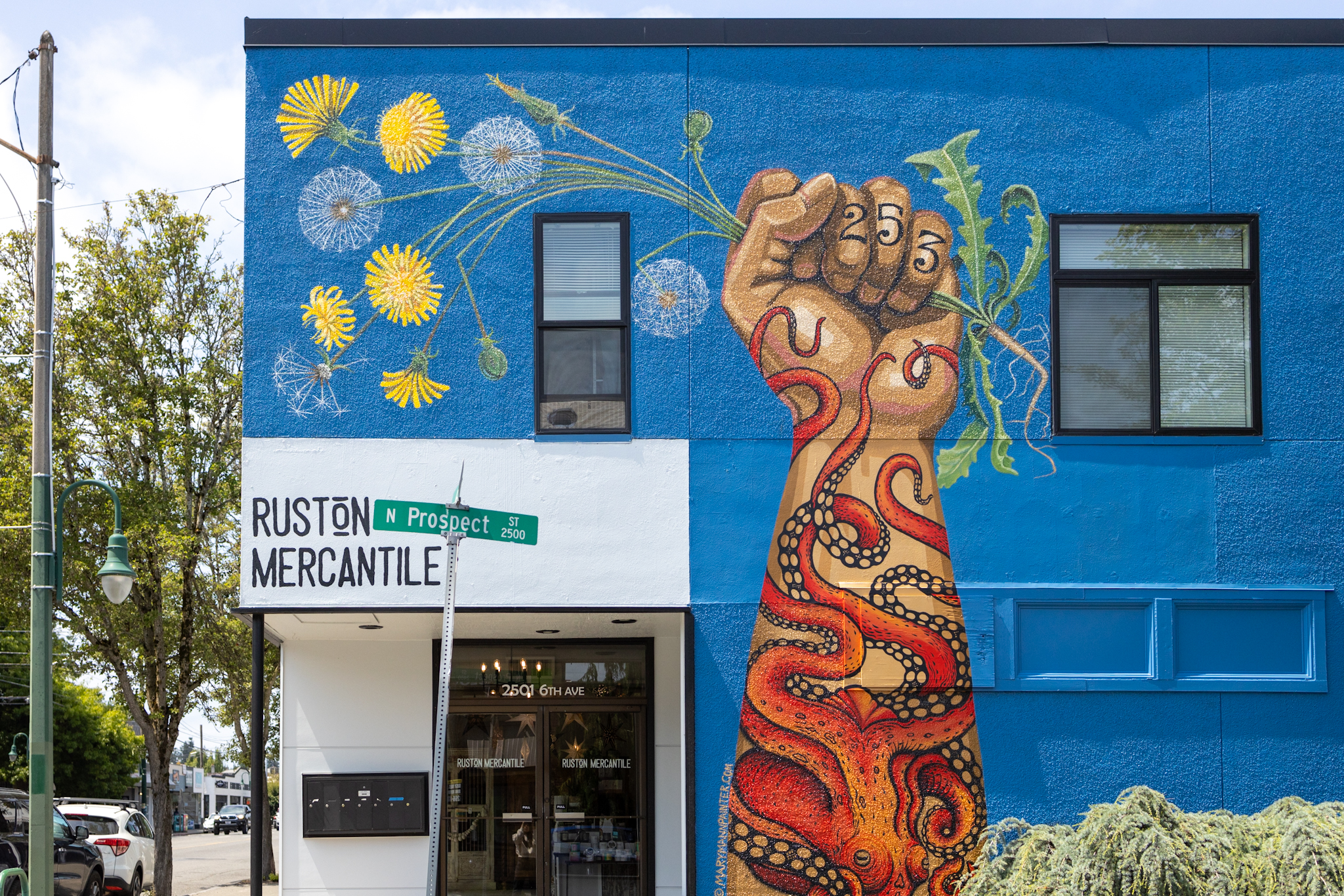 “‘Dandelion Rebellion’ represents local pride in the 253. The fist grasping a bunch of dandelions is a symbol of empowerment and determination. An octopus tattoo wraps around the forearm reflecting our proximity to the Puget Sound and the famous Giant Pacific Octopus that thrive in our waters.