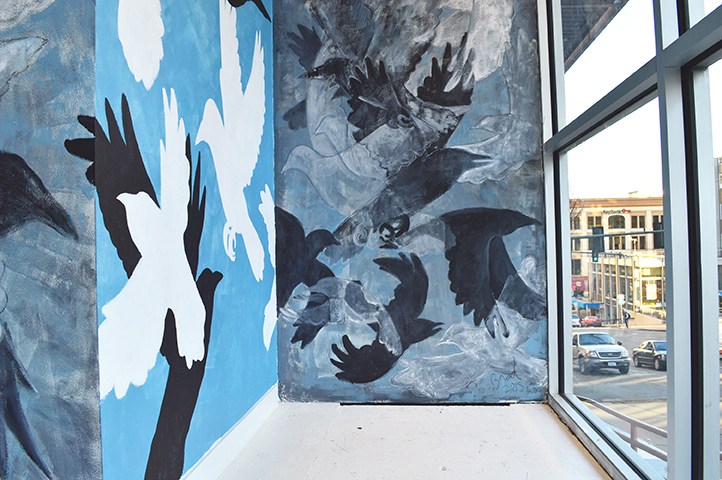 This haiku, written by Brad Dinsmore, accompanies his window installation and provides a tone for the work. The installation includes Dinsmore’s canvas paintings with layered imagery of doves and ravens, which progress into a large painting directly on the wall, wrapping around corners, and reaching from floor to ceiling