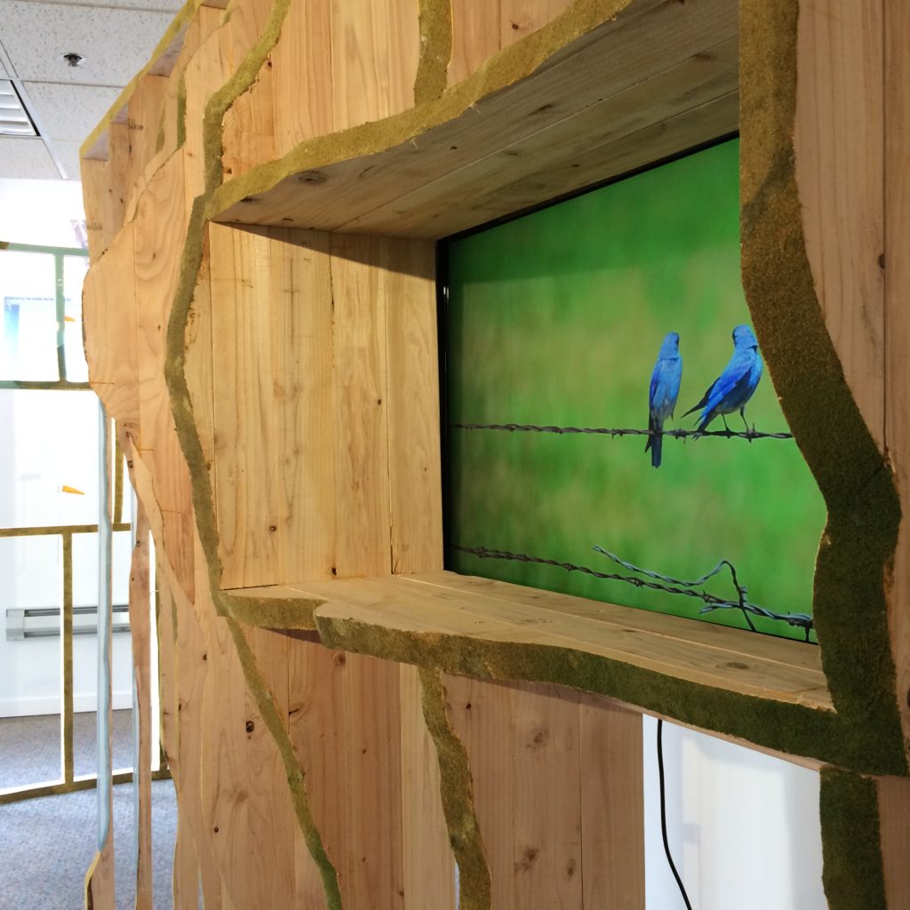 Liminal is a multi-media installation that explores these transient moments. The space is found under construction, divided into smaller rooms by classic wood house framing construction. One is confronted with familiar structures, while maneuvering thru framed doorways and glancing thru framed windows. Expectations are curbed by contradiction — the outside is structured, predetermined, confined and orderly, but the interiors are vast, open vistas — serene yet placeless. The interior spaces speak of possibility, yet provide no destination. Fans blow dozens of tiny orange windsocks into a spinning swarm of confusion. One is left directionless, not knowing which way the wind will take them.