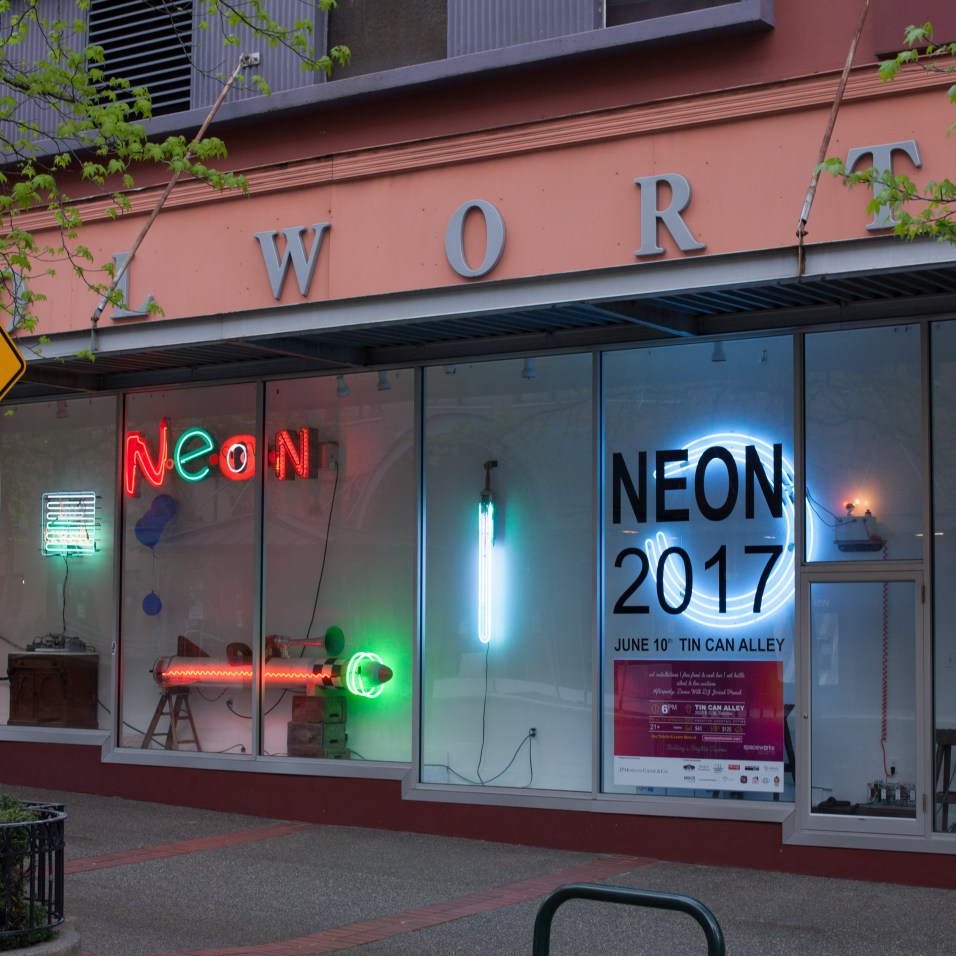 In preparation for Spaceworks’ 2nd annual fundraiser NEON, artist Galen Turner installed a flashy, tongue-in-cheek Artscape in one of the Woolworth Windows.