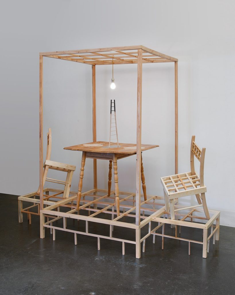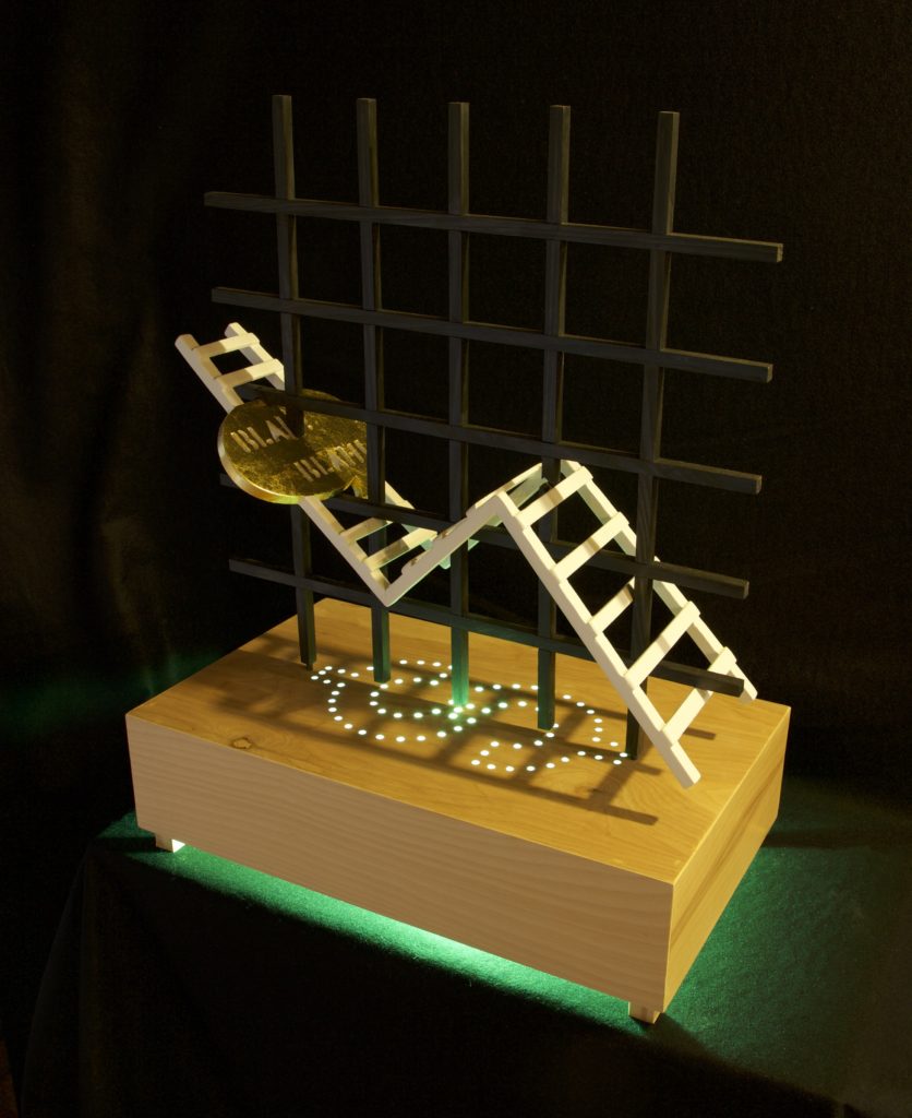 “Not Enough Room for the Third Blah” sculpture by Tom Gormally, 2017. Wood, Paint, Gold Leaf, LED Lights. Photo by Malayka Gormally.