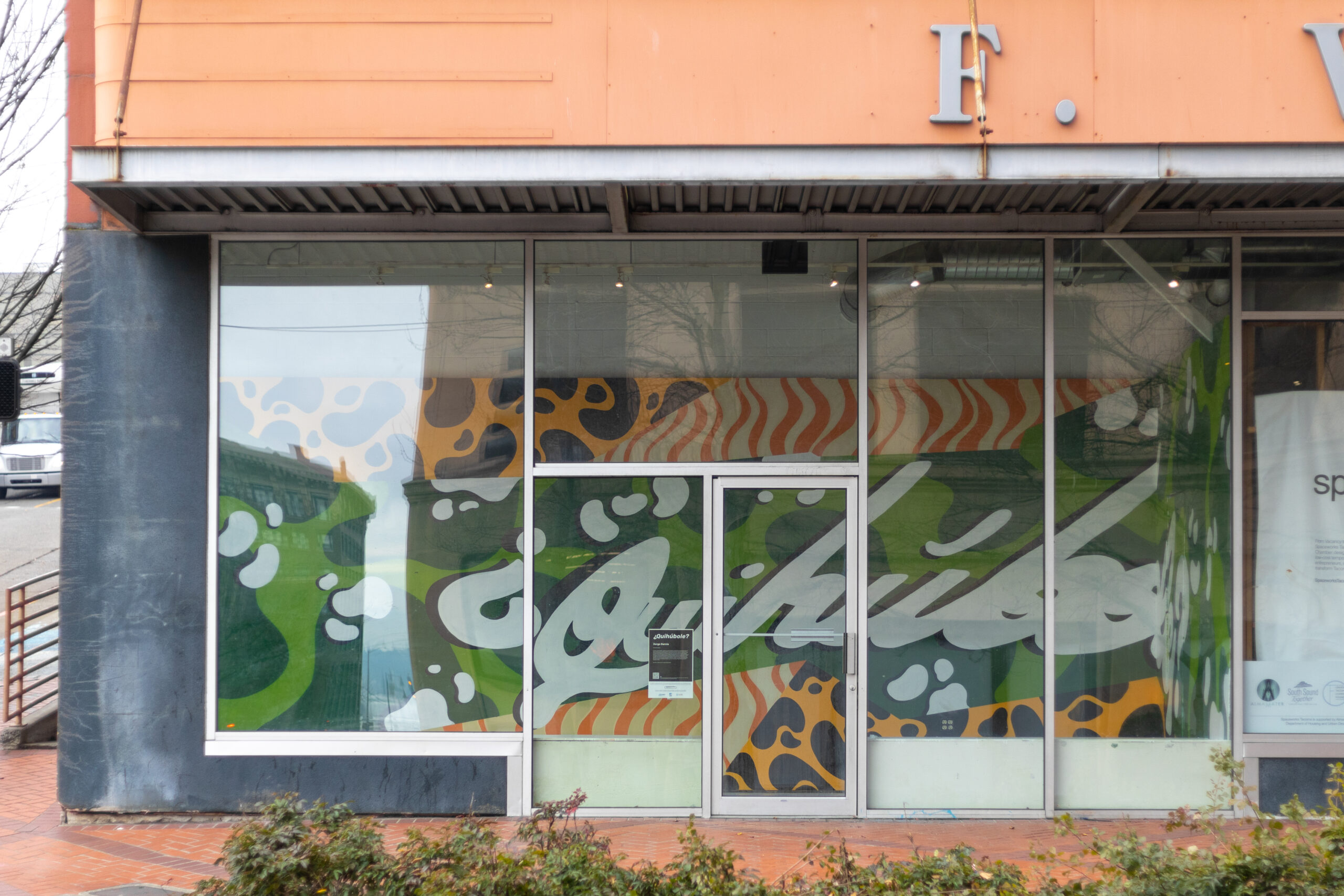 As a Chicano Tacoma resident, Jorge has a nuanced and fluent understanding of the intricate dynamics of the city. Because of this he wants to represent our diverse communities and culture through public art. Utilizing strong shapes and bold lettering he is able to create murals that reflect the community. Jorge’s art employs bold backgrounds and large groups of colors, which makes executing powerful designs possible. This piece was designed with the thought of bringing different kinds of cultural representation to the downtown area. By utilizing the Woolworth Window to display a Spanish phrase/greeting, he hopes to broaden the horizon of who downtown art is for, welcoming native Spanish speakers into the area. “Quihúbole” (kee-oo-boh-leh), also seen spelled Quiúbole, translates to “What’s up?” but holds more significance, as it’s more accurately translated as a conversation starter. Jorge hopes that this installation also sparks interest for non-Spanish speakers to pick up a new phrase or begin learning about the language or culture.