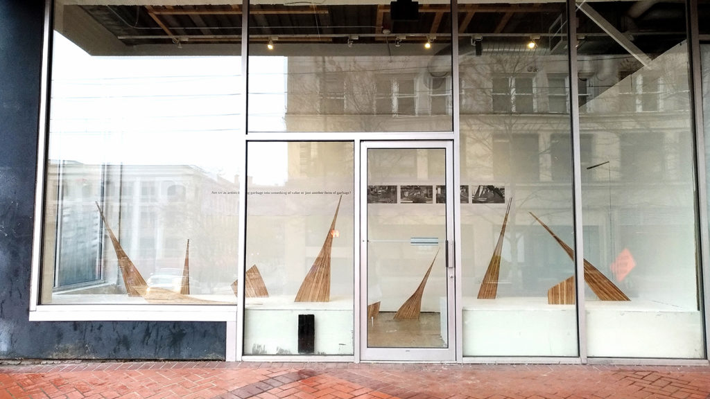 Years went by. The bundles remained untouched in storage until 2018 when we had to reclaim the space. We took each bundle back to a band saw, the same tool used for milling, to trim edges, cut into planks and divide the planks into these objects. All the decisions made in the process were intuitive. As we completed the objects, a question began to emerge: “Are we as artists turning garbage into something of value or just another form of garbage?” Suppose the fate of these objects were different, on a sidewalk instead of inside this window. Would you still look at them the same way?