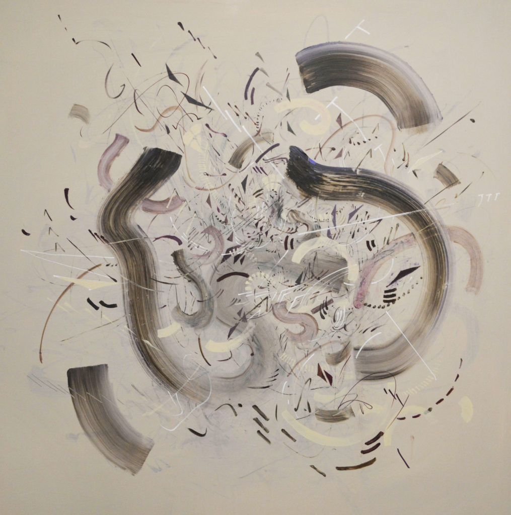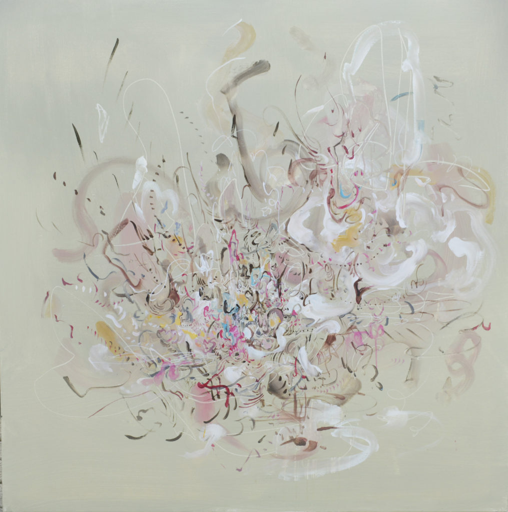 Her paintings fuse elemental shapes, linguistic scribbles, and simple gestural marks together to disrupt the abstract space with different variations of cadence and movement. These components interact in an elusive yet active manner to conceive not so much an image, but rather an entity, that exhibits a delicate intensity. By adjusting the speed, pressure, and inclination of her brush, she imbues each stroke with its own distinct spirit; a stroke extending down and to the right expresses release, while a stroke lifting upwards invokes a sense of crescendo. The rhythm formation reaches a conclusion when the spirit embodied by the entity is balanced in harmony and has been fully realized.