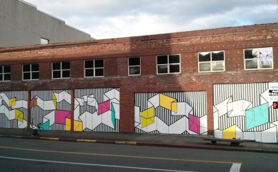 “celebrates the revitalization of Tacoma’s bustling downtown corridor and encourages youth participation in the arts. The design incorporates bold colors and overlapping planes that stretch across the mural’s surface to create a unified composition. Like the networks of shapes that shift before the viewer’s eyes Tacoma is a city constantly transforming and reinventing itself. However, the roots of its history and traditions, its stripes, stand to remind us of what came before.”