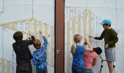 Diana Leigh Surma has been inviting volunteers and students to join in on the creation of her mural titled “Show Your Stripes.” In describing this intricately laid out design of geometric shapes Diana comments that this project