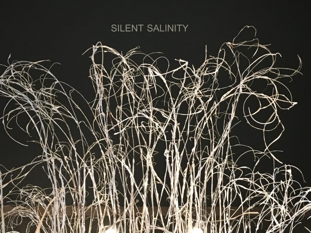 “I use the language of metaphor to examine contemporary issues. Silent Salinity explores the relationship between water, global warming and culture. Through a two-year partnership with spatial ecologist Roger Fuller, I examined the dangerously increased salinity levels encroaching on local estuaries, and on consequently our freshwater re-sources. The work in this show is inspired by these conversations and resulted in telling the story symbolically through the medium of salt.” -Mary Coss (www.marycoss.com)