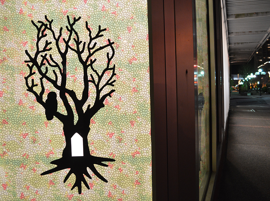This interactive installation invites viewers to peek inside a series of glowing peep holes to see the secret worlds inside. www.spaceworkstacoma.com www.koncsek.com