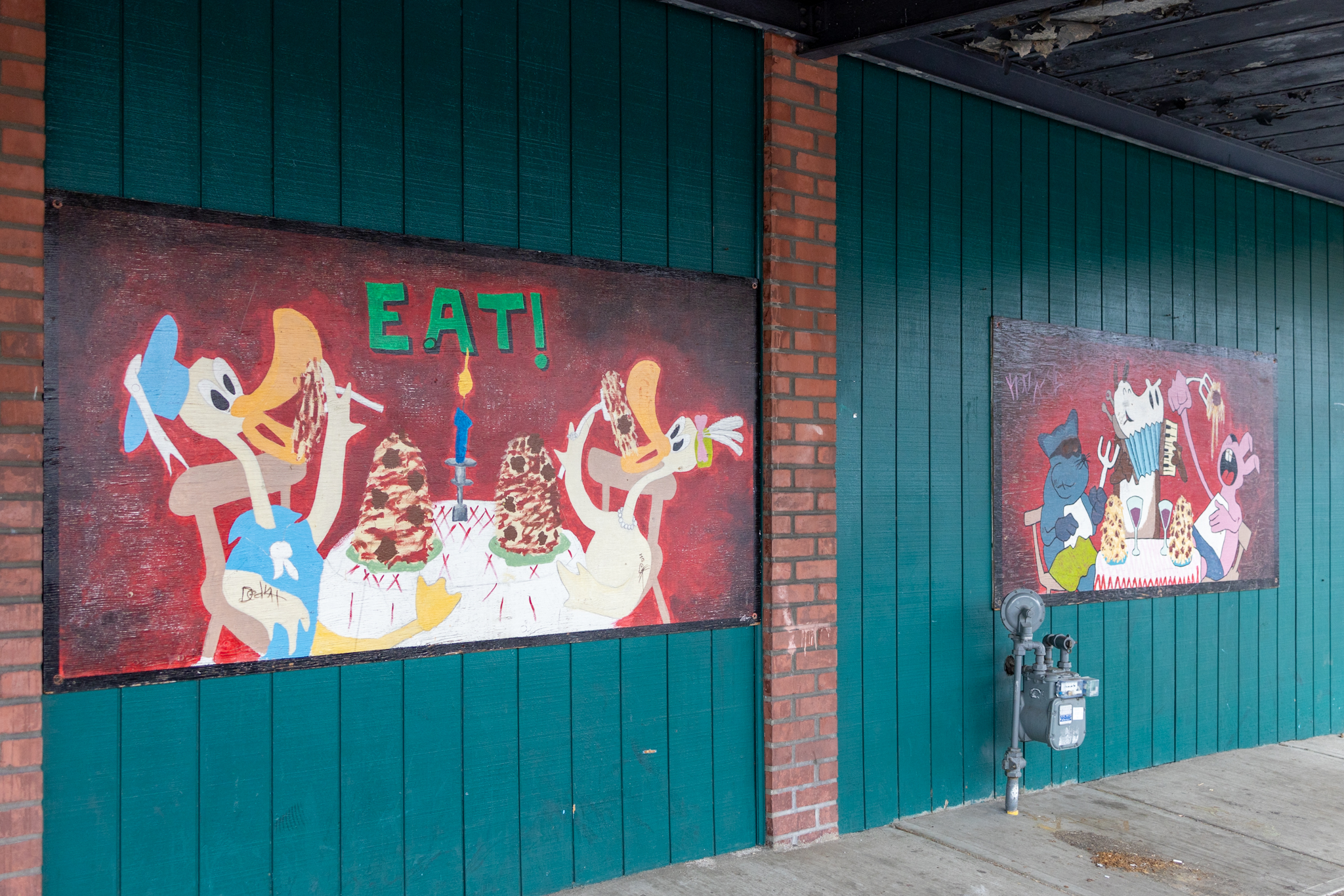 “In these two panels, a collaboration by R.R. Anderson and Morgan Alexander, the viewer is looking through the window of an Italian restaurant where cartoon characters are enjoying large plates of spaghetti and meatballs. They have been mounted on the former sausage factory next to Vallhalla Hall in the 1200 block of MLK Jr. Way since the “Music and Murals” event in September of 2007.