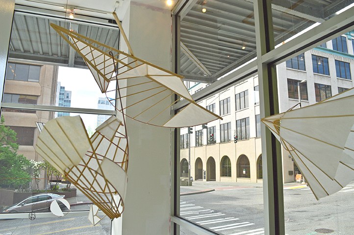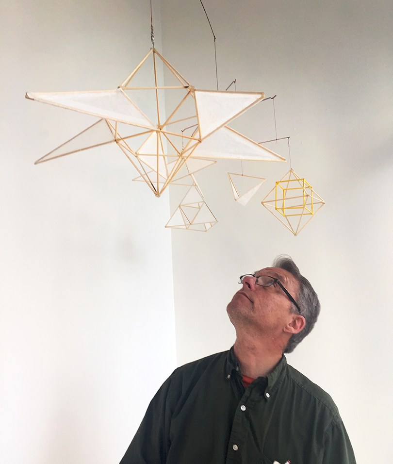 Roger states “This piece and many of my pieces work with balance, movement, and color. These pieces started as a method of entertaining my daughter and myself as we lay in bed trying to take naps. But, the initial steps of making have lead to adding objects as volumes. From that point, it has become easy and a downhill slope to adding my geometric investigations, and formal constructs as elements to the designs. These follow easily from the other work I have done, wind vanes, kinetics, and color covered forma constructions.”