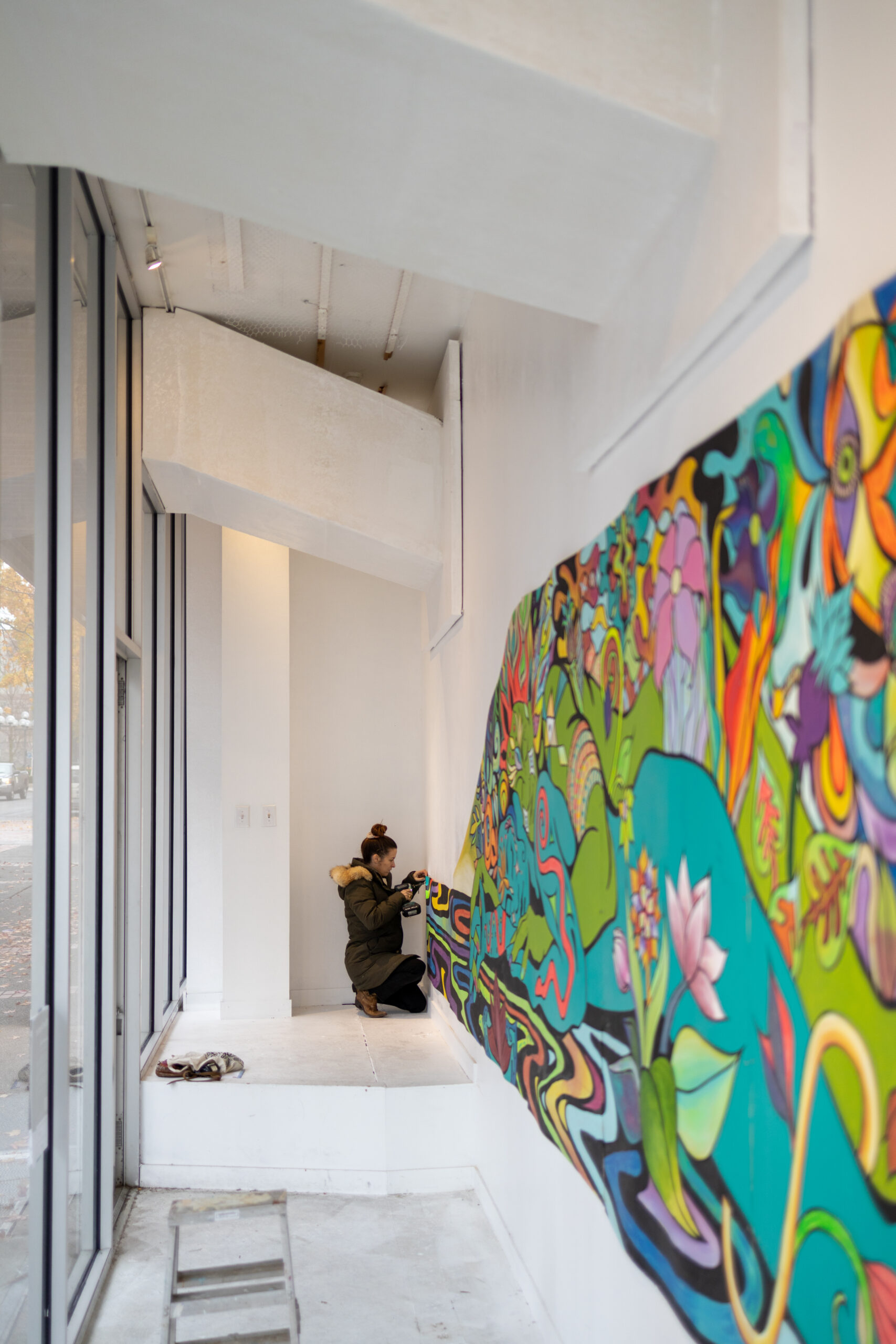 The result is the collective mural you see today. It was absolutely thrilling to release control of the finished product and to collaborate with an entire community. Except for the plywood panels themselves, all the paint was salvaged from other mural projects and donated by artist friends. It is a mixture of acrylic and latex house paint.”