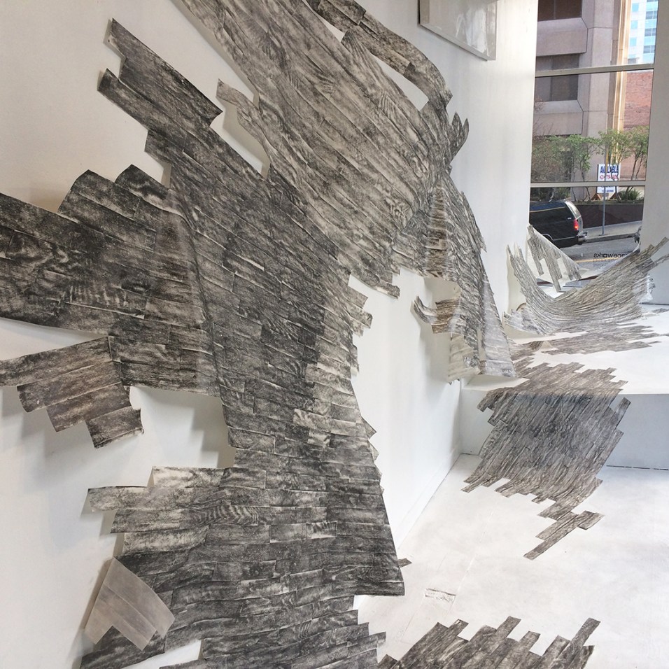 By physically cutting, joining, and transforming the graphite rubbings of an old wood floor, the artist allows these silvery grey traces and scratches to undergo a metamorphosis – a visual transformation that is meant to spark familiar recollection as well as a sense of profound loss knowing that our memories of the past are incomplete, fragmented, and often reconfigured over time.