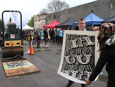 “It was definitely the worst weather in my recollection” with the exception of one year when tents were required, says stalwart founder, Jessica Spring. “The shrain (sun and rain) let up enough for us to get prints done, but the steamroller drivers, especially, froze.” A steamroller was used to make the 4′ linocut prints that are the trademark of this proud event.